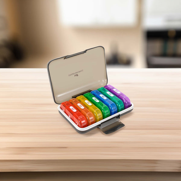 Jeder Tag ist farblich unterschiedlich gestaltet, was die Orientierung und Handhabung noch einfacher macht. So erkennen Sie auf einen Blick, welcher Tag ansteht und ob Sie alle Tabletten für den Tag eingenommen haben.